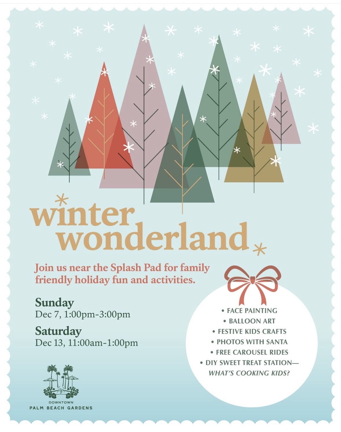 December 7 @ 1:00 pm - 3:00 pm Winter Wonderland at Downtown Palm Beach Gardens